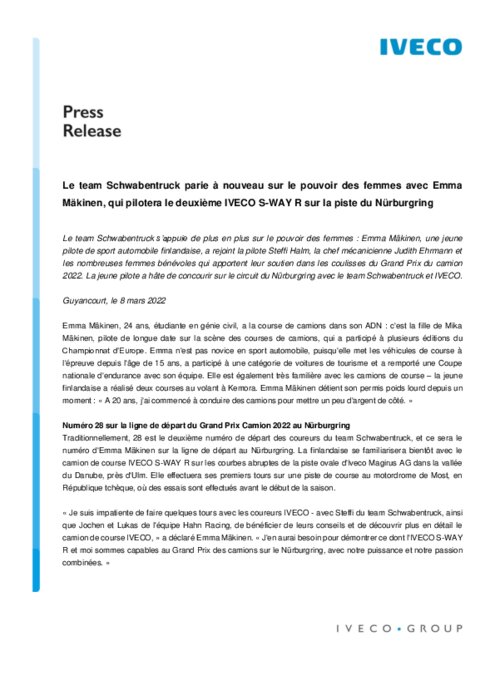 Emma Mäkinen, 24 ans, étudiante en génie civil, a la course de camions dans son ADN : c'est la fille de Mika Mäkinen, pilote de longue date sur la scène des courses de camions, qui a participé à plusieurs éditions du Championnat d’Europe. Emma n'est pas novice en sport automobile, puisqu'elle met les véhicules de course à l'épreuve depuis l'âge de 15 ans, a participé à une catégorie de voitures de tourisme et a remporté une Coupe nationale d'endurance avec son équipe...