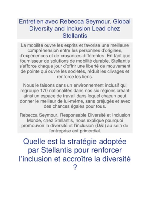 La mobilité ouvre les esprits et favorise une meilleure compréhension entre les personnes d’origines, d’expériences et de croyances différentes. En tant que fournisseur de solutions de mobilité durable, Stellantis s’efforce chaque jour d’offrir une liberté de mouvement de pointe qui ouvre les sociétés, réduit les clivages et renforce les liens. Rebecca Seymour, Responsable Diversité et Inclusion Monde, chez Stellantis, nous explique pourquoi promouvoir la diversité et l’inclusion.