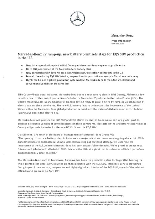 Mercedes-Benz prévoit de commencer à produire dans les prochains mois dans son actuelle usine de Tuscaloosa en Alabama les variantes SUV de l'EQS, la version à batterie de la Mercedes Classe S, et de l'EQE.