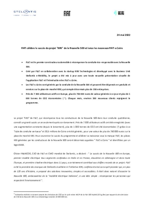 Le projet "KIRI" de FIAT, qui récompense tous les conducteurs de la Nouvelle 500 dans leur conduite quotidienne, connaît un grand succès un an seulement après son lancement. Près de 7 300 utilisateurs actifs ont été enregistrés (avec une augmentation constante depuis le lancement), plus de 1 000 tonnes de CO2 ont été économisées grâce à ce "style de conduite vertueux" et 30,5 millions de Coins ont été générés, pour une valeur de plus de 750 000 euros sur la place de marché KIRI.