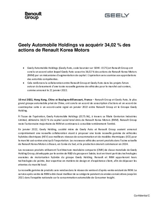 Geely Automobile Holdings (Geely Auto, code boursier sur SEHK : 0175) et Renault Group ont conclu un accord selon lequel Geely Auto souscrira 34,02 % des actions de Renault Korea Motors (RKM) par un mécanisme d'augmentation de capital. L'opération sera soumise aux approbations des autorités compétentes.