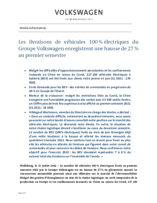Groupe Volkswagen : +27% au T1 2022 de VE