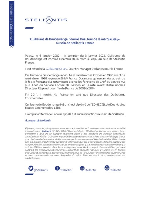 À compter du 3 janvier 2022, Guillaume de Boudemange est nommé Directeur de la marque Jeep au sein de Stellantis France. Il est rattaché à Guillaume Couzy, Country Manager Stellantis pour la France. Guillaume de Boudemange a débuté sa carrière chez Citroën en 1995 avant de rejoindre en 1999 le groupe BMW France.