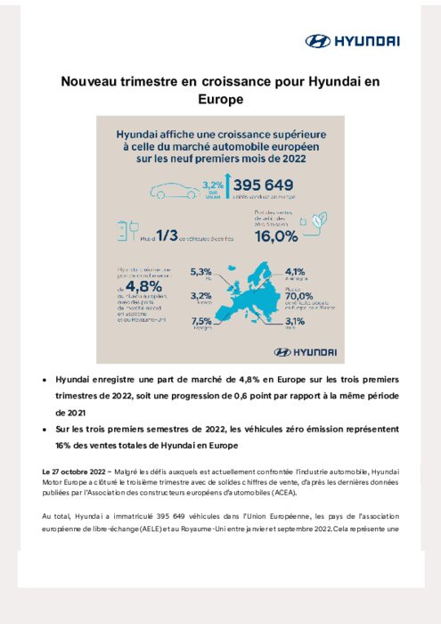 Malgré les défis auxquels est actuellement confrontée l'industrie automobile, Hyundai Motor Europe a clôturé le troisième trimestre avec de solides chiffres de vente, d’après les dernières données publiées par l’Association des constructeurs européens d’automobiles (ACEA).