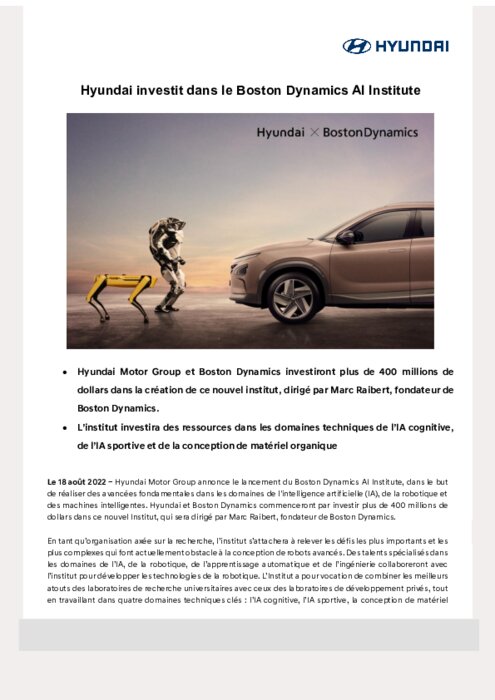 Hyundai Motor Group annonce le lancement du Boston Dynamics AI Institute, lieu dédié à l'intelligence artificielle, à la robotique et aux machines intelligentes. Hyundai et Boston Dynamics commenceront par investir plus de 400 millions de dollars dans ce nouvel institut, qui sera dirigé par Marc Raibert, fondateur de Boston Dynamics.