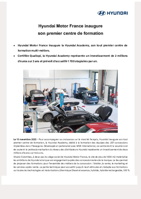 Hyundai Motor France inaugure son tout premier centre de formation multi-métiers. La Hyundai Academy, certifiée Qualiopi, représente un investissement de 2 millions d’euros sur 3 ans et prévoit d’accueillir 1 700 stagiaires par an. Veuillez trouver ci-joint le communiqué de presse relatif à cette annonce.
