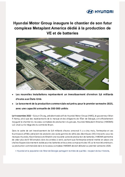 Hyundai Motor Group inaugure une nouvelle usine de fabrication de véhicules électriques et de batteries dans l’Etat de Géorgie aux Etats-Unis, complétant ainsi son réseau mondial de production de VE. Les installations représentent un investissement de 5,6 milliards d’euros et traduisent la stratégie du groupe qui prévoit d’immatriculer 3,23 millions de véhicules électriques par an d'ici 2030.