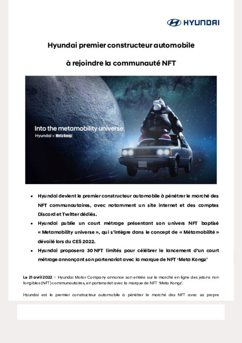 Hyundai Motor Company annonce son entrée sur le marché en ligne des jetons non fongibles (NFT) communautaires, en partenariat avec la marque de NFT ‘Meta Kongz’. Hyundai est le premier constructeur automobile à pénétrer le marché des NFT avec sa propre communauté NFT, notamment par le biais du site officiel Hyundai NFT et de comptes Discord et Twitter