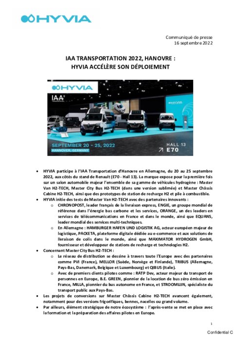 HYVIA participe à l’IAA Transportation d’Hanovre en Allemagne, du 20 au 25 septembre 2022, aux côtés du stand de Renault (E70 - Hall 13). La marque expose pour la première fois sur un salon automobile majeur l’ensemble de sa gamme de véhicules hydrogène : Master Van H2-TECH, Master City Bus H2-TECH (dans une version sublimée) et Master Châssis Cabine H2-TECH, ainsi que des prototypes de station de recharge H2 et pile à combustible.