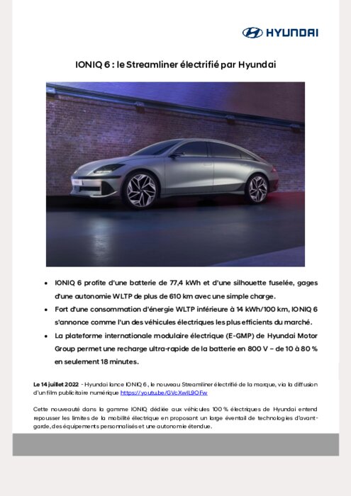 IONIQ 6 profite d’une batterie de 77,4 kWh et d’une silhouette fuselée, gages d’une autonomie WLTP de plus de 610 km avec une simple charge. Fort d’une consommation d'énergie WLTP inférieure à 14 kWh/100 km, IONIQ 6 s’annonce comme l’un des véhicules électriques les plus efficients du marché. La plateforme internationale modulaire électrique (E-GMP) de Hyundai Motor. Group permet une recharge ultra-rapide de la batterie en 800 V ‒ de 10 à 80 % en seulement 18 minutes.