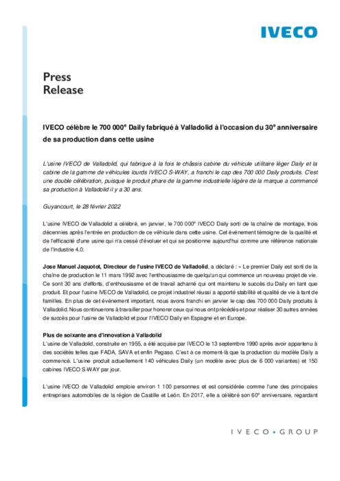 L'usine IVECO de Valladolid, qui fabrique à la fois le châssis cabine du véhicule utilitaire léger Daily et la cabine de la gamme de véhicules lourds IVECO S-WAY, a franchi le cap des 700 000 Daily produits. C'est une double célébration, puisque le produit phare de la gamme industrielle légère de la marque a commencé sa production à Valladolid il y a 30 ans.