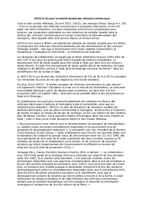 IVECO, une marque d’Iveco Group N.V. et un pionnier des véhicules commerciaux à propulsion alternative, et Eni ont signé une lettre d'intention. Les deux entreprises uniront leurs compétences pour