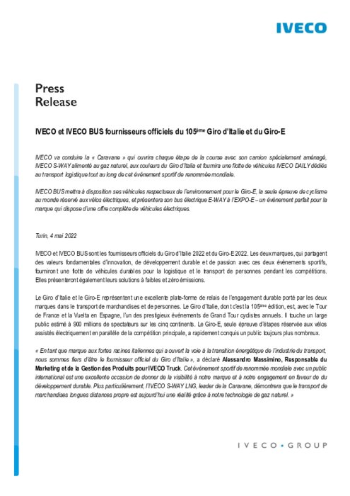 IVECO et IVECO BUS sont les fournisseurs officiels du Giro d’Italie 2022 et du Giro-E 2022. Les deux marques, qui partagent des valeurs fondamentales d’innovation, de développement durable et de passion avec ces deux évènements sportifs, fourniront une flotte de véhicules durables pour la logistique et le transport de personnes pendant les compétitions. Elles présenteront également leurs solutions à faibles et zéro émissions.