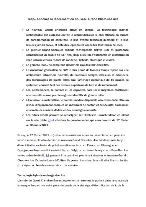 Le nouveau Grand Cherokee arrive en Europe. La technologie hybride rechargeable 4xe exclusive en fait le Grand Cherokee le plus efficace en termes de consommation de carburant, le plus avancé technologiquement et le plus luxueux jamais conçu, et doté des légendaires capacités tout-terrain de Jeep.