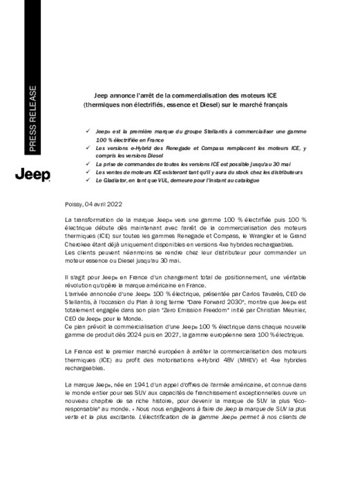La transformation de la marque Jeep vers une gamme 100 % électrifiée puis 100 % électrique débute dès maintenant avec l'arrêt de la commercialisation des moteurs thermiques (ICE) sur toutes les gammes Renegade et Compass, le Wrangler et le Grand Cherokee étant déjà uniquement disponibles en versions 4xe hybrides rechargeables. Les clients peuvent néanmoins se rendre chez leur distributeur pour commander un moteur essence ou Diesel jusqu'au 30 mai.