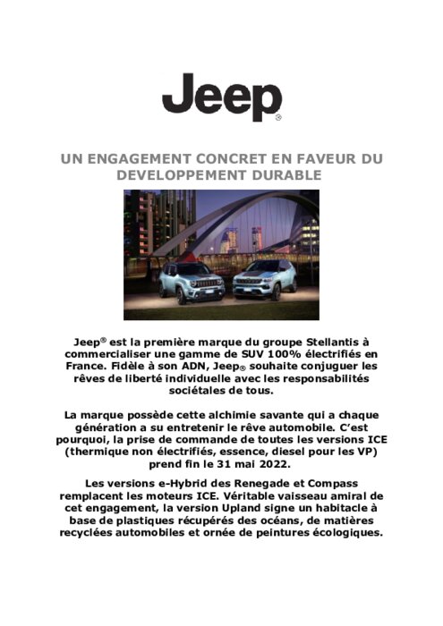 Jeep est la première marque du groupe Stellantis à commercialiser une gamme de SUV 100% électrifiés en France. Fidèle à son ADN, Jeep souhaite conjuguer les rêves de liberté individuelle avec les responsabilités sociétales de tous.