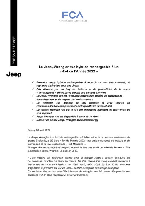 La Jeep Wrangler 4xe hybride rechargeable, véritable icône de la marque américaine du groupe Stellantis, a été élue « 4x4 de l’Année 2022 » par un jury composé de lecteurs et de journalistes de la revue spécialisée « 4x4 Magazine ». Wrangler 4xe est la septième Jeep à recevoir le titre très envié de « 4x4 de l’Année ». Elle succède à la Jeep Wrangler JL élue en 2019.