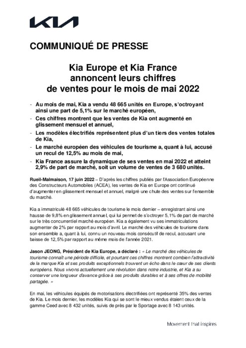 Au mois de mai, Kia a vendu 48 665 unités en Europe, s’octroyant ainsi une part de 5,1% sur le marché européen. Ces chiffres montrent que les ventes de Kia ont augmenté en glissement mensuel et annuel. Les modèles électrifiés représentent plus d’un tiers des ventes totales de Kia. Le marché européen des véhicules de tourisme a, quant à lui, accusé un recul de 12,5% au mois de mai,