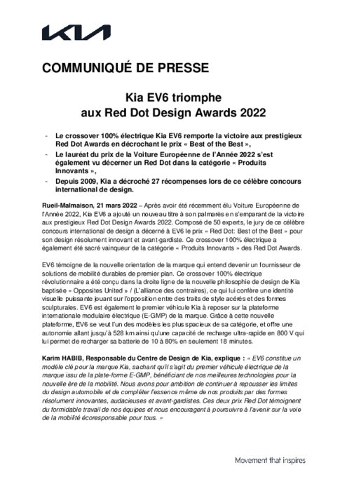 Après avoir été récemment élu Voiture Européenne de l’Année 2022, Kia EV6 a ajouté un nouveau titre à son palmarès en s’emparant de la victoire aux prestigieux Red Dot Design Awards 2022. Composé de 50 experts, le jury de ce célèbre concours international de design a décerné à EV6 le prix « Red Dot: Best of the Best » pour son design résolument innovant et avant-gardiste. Ce crossover 100% électrique a également été sacré vainqueur de la catégorie « Produits Innovants » des Red Dot Awards.