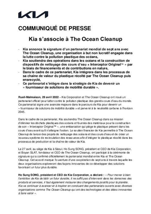 Kia annonce la signature d’un partenariat mondial de sept ans avec The Ocean Cleanup, une organisation à but non lucratif engagée dans la lutte contre la pollution plastique des océans. Kia soutiendra des opérations dans les océans et la construction de dispositifs de nettoyage des cours d’eau « Interceptor Original » par le biais de financements et de contributions en nature. Kia intégrera dans les processus de sa chaîne de valeur du plastique récolté par The Ocean Cleanup.