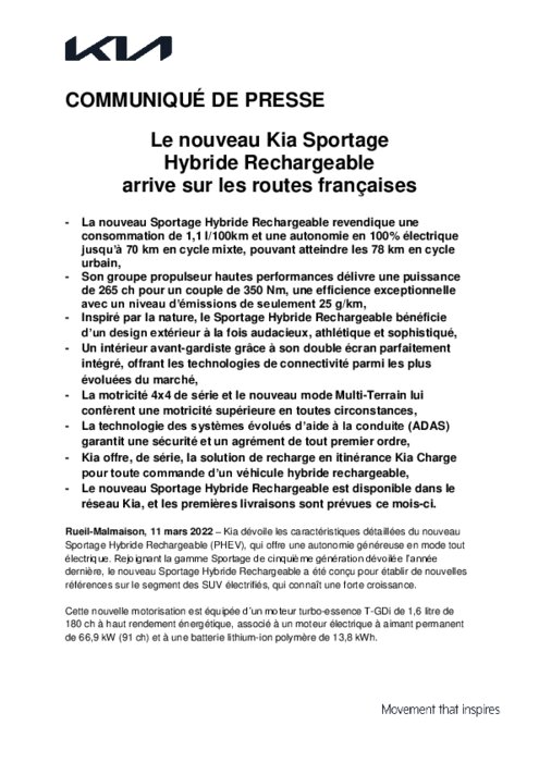 Kia dévoile les caractéristiques détaillées du nouveau Sportage Hybride Rechargeable (PHEV), qui offre une autonomie généreuse en mode tout électrique. Rejoignant la gamme Sportage de cinquième génération dévoilée l’année dernière, le nouveau Sportage Hybride Rechargeable a été conçu pour établir de nouvelles références sur le segment des SUV électrifiés, qui connaît une forte croissance. Cette nouvelle motorisation est équipée d’un moteur turbo-essence T-GDi de 1,6 litre de 180 ch...