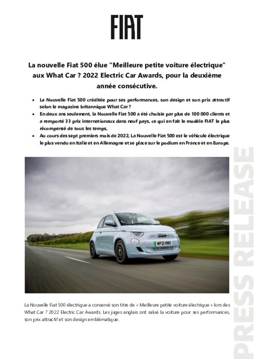 La Nouvelle Fiat 500 électrique a conservé son titre de « Meilleure petite voiture électrique » lors des What Car ? 2022 Electric Car Awards. Les juges anglais ont salué la voiture pour ses performances, son prix attractif et son design emblématique.