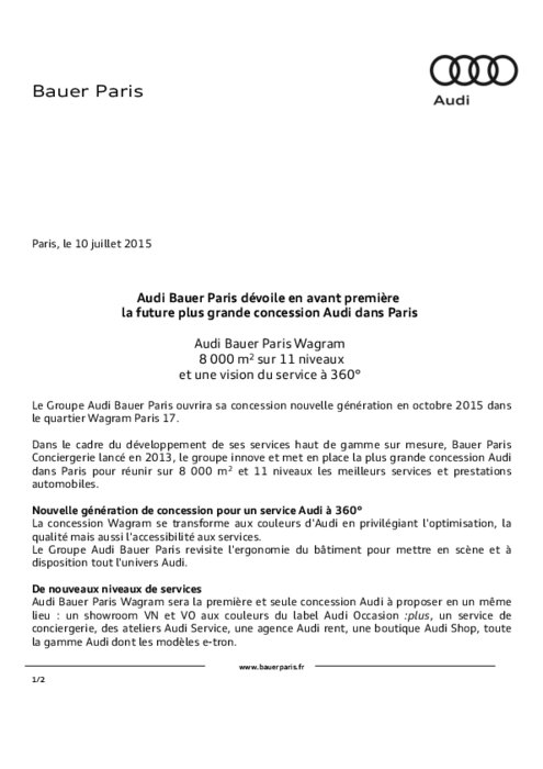 Le Groupe Audi Bauer Paris ouvrira sa concession nouvelle génération en octobre 2015 dans le quartier Wagram Paris 17. Dans le cadre du développement de ses services haut de gamme sur mesure, Bauer Paris Conciergerie lancé en 2013, le groupe innove et met en place la plus grande concession Audi dans Paris pour réunir sur 8 000 m2 et 11 niveaux les meilleurs services et prestations automobiles.