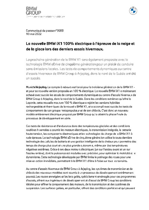 La prochaine génération de la BMW X1 sera également proposée avec la technologie BMW eDrive de cinquième génération pour un plaisir de conduire sans émissions locales. Les tests de comportements dynamiques au centre d'essais hivernaux de BMW Group à Arjeplog, dans le nord de la Suède ont été un succès.