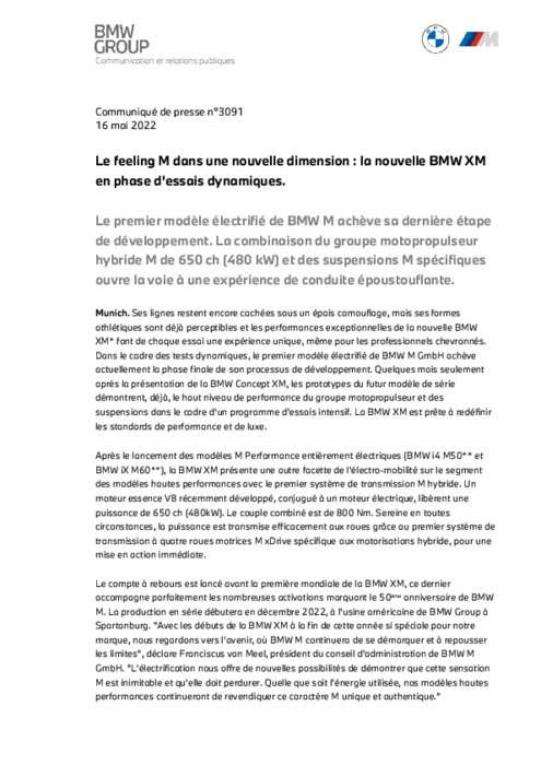 Le premier modèle électrifié de BMW M achève sa dernière étape de développement. La combinaison du groupe motopropulseur hybride M de 650 ch (480 kW) et des suspensions M spécifiques ouvre la voie à une expérience de conduite époustouflante.