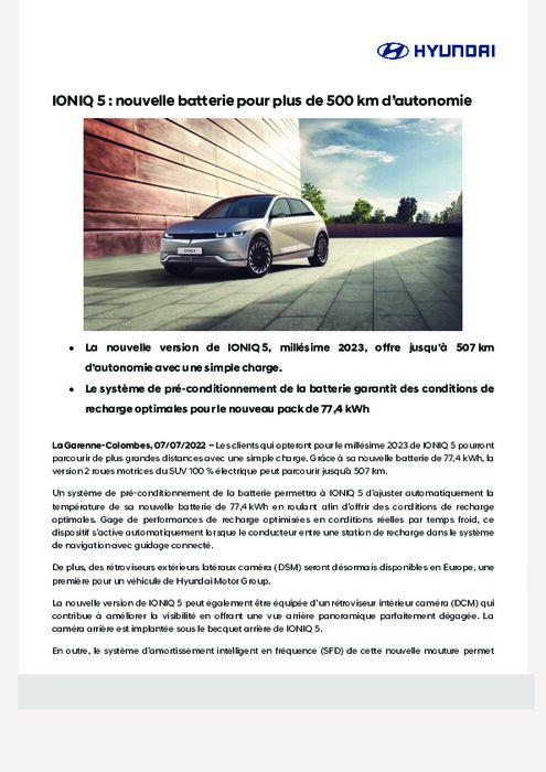 La nouvelle version de IONIQ 5, millésime 2023, offre jusqu’à 507 km d’autonomie avec une simple charge. Le système de pré-conditionnement de la batterie garantit des conditions de recharge optimales pour le nouveau pack de 77,4 kWh