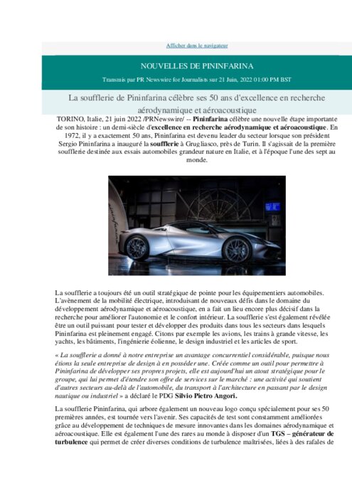 Pininfarina célèbre une nouvelle étape importante de son histoire : un demi-siècle d'excellence en recherche aérodynamique et aéroacoustique. En 1972, il y a exactement 50 ans, Pininfarina est devenu leader du secteur lorsque son président Sergio Pininfarina a inauguré la soufflerie à Grugliasco, près de Turin. Il s'agissait de la première soufflerie destinée aux essais automobiles grandeur nature en Italie, et à l'époque l'une des sept au monde.