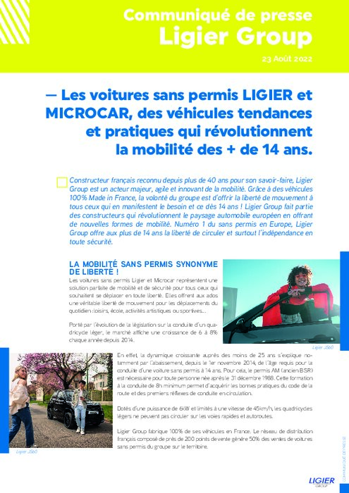 Constructeur français reconnu depuis plus de 40 ans pour son savoir-faire, Ligier Group est un acteur majeur, agile et innovant de la mobilité. Grâce à des véhicules 100% Made in France, la volonté du groupe est d’offrir la liberté de mouvement à tous ceux qui en manifestent le besoin et ce dès 14 ans ! Ligier Group fait partie des constructeurs qui révolutionnent le paysage automobile européen en offrant de nouvelles formes de mobilité. Numéro 1 du sans permis en Europe.