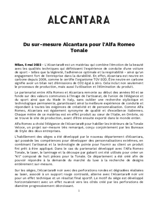 Constructeurs 05 mai 2022 - 14:23 Alfa Romeo a choisi l'élégance de l'Alcantara pour habiller les intérieurs de la Tonale Veloce, un projet sur-mesure très remarqué, conçu conjointement par les Bureaux de Style des deux entreprises. PDF (175 Ko) Télécharger