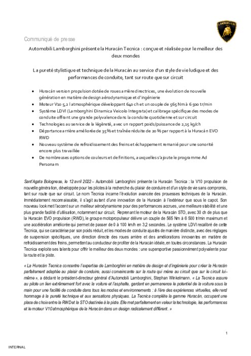 Automobili Lamborghini présente la Huracán Tecnica : la V10 propulsion de nouvelle génération, développée pour les pilotes à la recherche du plaisir de conduire et d’un style de vie sans compromis, tant sur route que sur circuit.