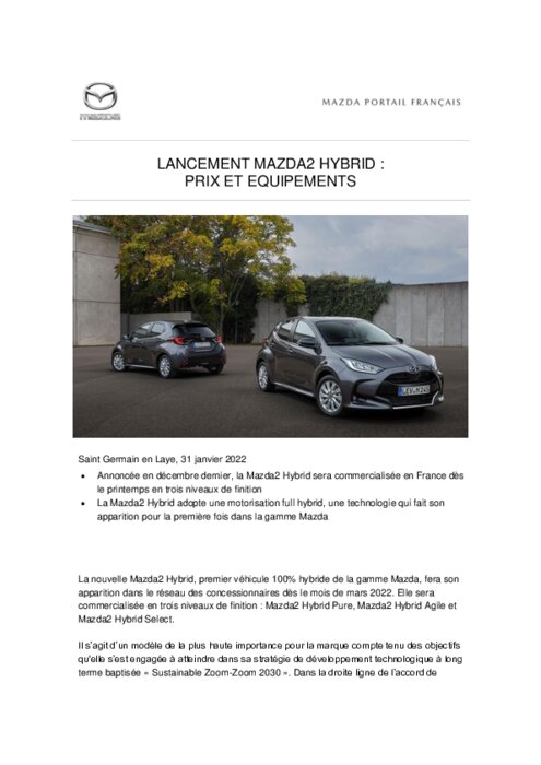 La nouvelle Mazda2 Hybrid, premier véhicule 100% hybride de la gamme Mazda, fera son apparition dans le réseau des concessionnaires dès le mois de mars 2022. Elle sera commercialisée en trois niveaux de finition : Mazda2 Hybrid Pure, Mazda2 Hybrid Agile et Mazda2 Hybrid Select.