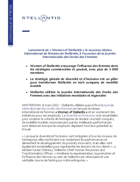 Stellantis a célébré la Journée Internationale des Droits des Femmes en lançant le réseau international de femmes « Women of Stellantis » et en soutenant des initiatives pour ses employés. La diversité et l’inclusion sont essentielles pour soutenir la volonté de l’entreprise de devenir une tech company de mobilité durable, reconnaissant que les meilleures performances sont obtenues lorsque les employés déploient tout leur potentiel au travail.