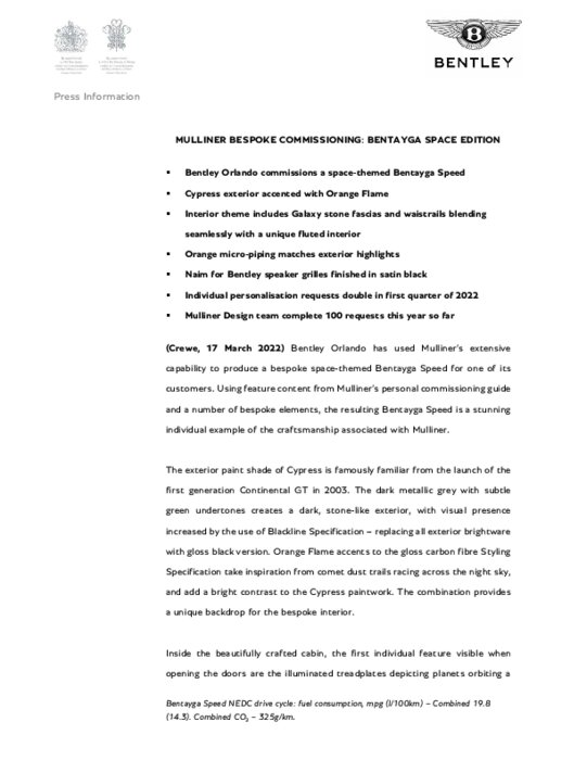 Bentley Orlando a fait appel aux compétences étendues de Mulliner pour produire une Bentayga Speed sur le thème de l'espace pour l'un de ses clients. Utilisant le contenu du guide de commande personnel de Mulliner et un certain nombre d'éléments sur mesure, la Bentayga Speed qui en résulte est un exemple individuel étonnant du savoir-faire associé à Mulliner.