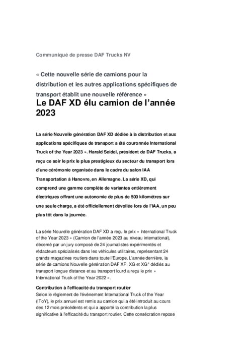 La série Nouvelle génération DAF XD dédiée à la distribution et aux applications spécifiques de transport a été couronnée International Truck of the Year 2023 ». Harald Seidel, président de DAF Trucks, a reçu ce soir le prix le plus prestigieux du secteur du transport lors d'une cérémonie organisée dans le cadre du salon IAA Transportation à Hanovre, en Allemagne.