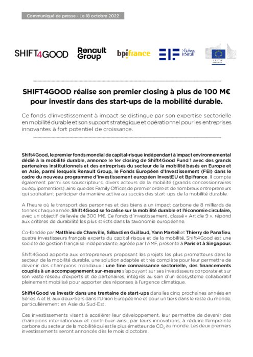 Parmi les principaux investisseurs figurent le groupe français Renault, la banque d'investissement BpiFrance et le Fonds européen d'investissement, qui représentent à eux trois "environ 80%" de la somme récoltée, a indiqué à l'AFP Yann Marteil, l'un des fondateurs de Shift4Good.