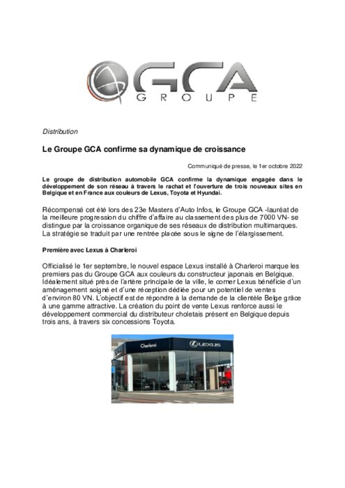 Le groupe de distribution automobile GCA confirme la dynamique engagée dans le développement de son réseau à travers le rachat et l'ouverture de trois nouveaux sites en Belgique et en France aux couleurs de Lexus, Toyota et Hyundai.