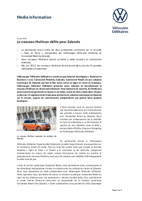 Volkswagen Véhicules Utilitaires a conclu un partenariat stratégique « Business to Business » avec Connected Retail by Zalando. Connected Retail est une solution numérique de Zalando qui fait le lien entre vente en ligne et vente en boutique. Volkswagen Véhicules Utilitaires présente cette solution en transformant le nouveau Multivan en showroom itinérant. Pour démarrer la tournée, les Multivans ainsi reconvertis partiront en Suisse et en Italie, avant de faire escale dans 10 pays et plus de 15