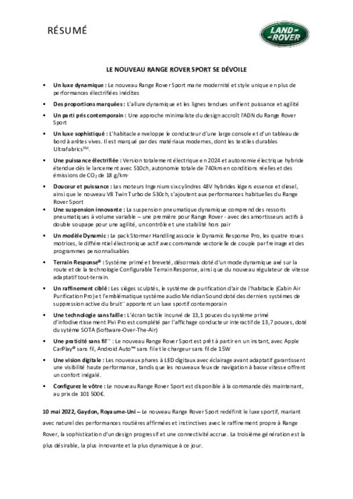 Constructeurs 11 mai 2022 - 09:00 Le nouveau Range Rover Sport redéfinit le luxe sportif, mariant avec naturel des performances routières affirmées couplées au raffinement propre d'un Range Rover, la sophistication d'un design moderne et une connectivité améliorée. PDF (429 Ko) Télécharger