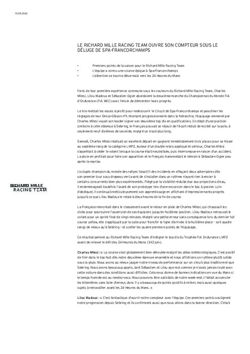 Le Richard Mille Racing Team ouvre son compteur sous le déluge de SPA-Francorchamps