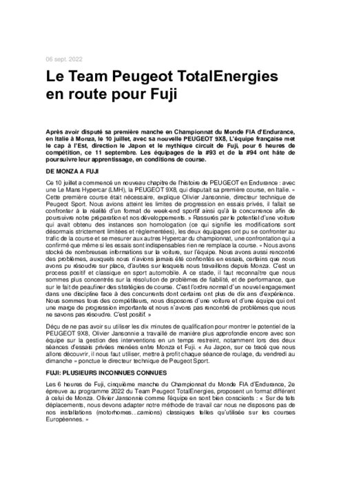 Après avoir disputé sa première manche en Championnat du Monde FIA d’Endurance, en Italie à Monza, le 10 juillet, avec sa nouvelle PEUGEOT 9X8, L’équipe française met le cap à l’Est, direction le Japon et le mythique circuit de Fuji, pour 6 heures de compétition, ce 11 septembre. Les équipages de la #93 et de la #94 ont hâte de poursuivre leur apprentissage, en conditions de course.