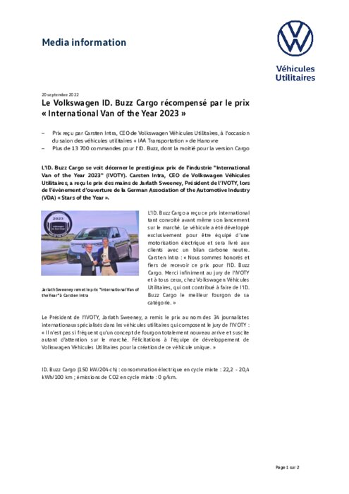L'ID. Buzz Cargo se voit décerner le prestigieux prix de l'industrie "International Van of the Year 2023" (IVOTY). Carsten Intra, CEO de Volkswagen Véhicules Utilitaires, a reçu le prix des mains de Jarlath Sweeney, Président de l’IVOTY, lors de l’évènement d’ouverture de la German Association of the Automotive Industry (VDA) « Stars of the Year ».