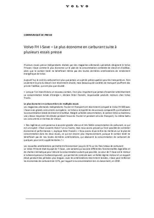 Plusieurs essais presse indépendants réalisés par des magazines allemands spécialisés désignent le Volvo FH avec I-Save comme le plus économe sur le plan de la consommation combinée de diesel et d’AdBlue, alors que le camion testé ne bénéficiait même pas des toutes dernières améliorations de rendement énergétique de Volvo.