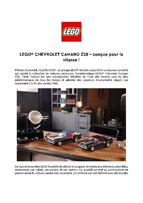 Le groupe LEGO® dévoile aujourd’hui un nouveau produit qui rejoint la collection de voitures anciennes, l'emblématique LEGO® Chevrolet Camaro Z28. Cette voiture est une reproduction détaillée de l'une des muscle cars les plus emblématiques de tous les temps et adorées des amateurs d'automobile depuis son lancement à la fin des années 1960.
