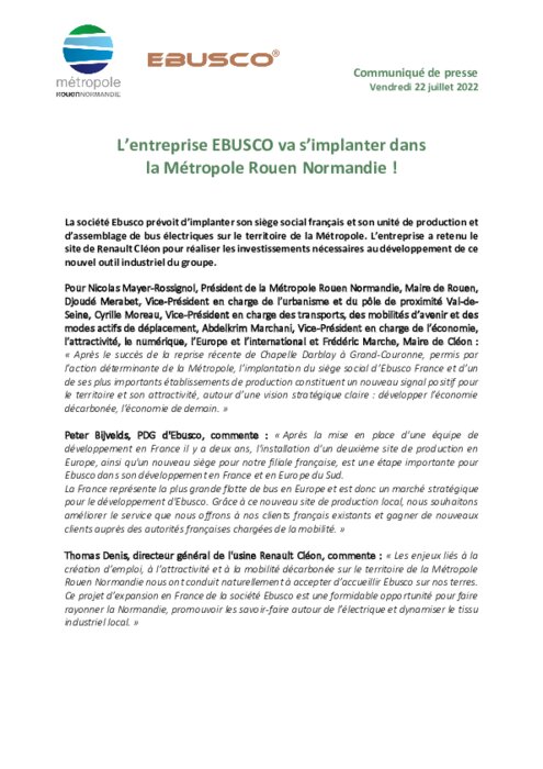 La société Ebusco prévoit d’implanter son siège social français et son unité de production et d’assemblage de bus électriques sur le territoire de la Métropole. L’entreprise a retenu le site de Renault Cléon pour réaliser les investissements nécessaires au développement de ce nouvel outil industriel du groupe.