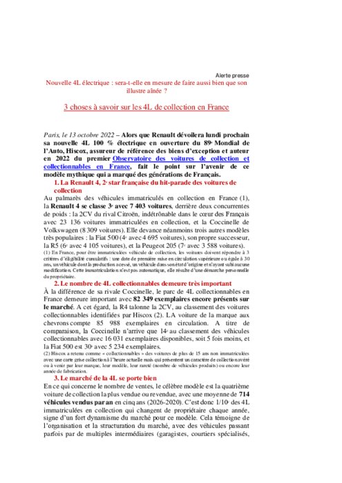 Alors que Renault dévoilera lundi prochain sa nouvelle 4L 100 % électrique en ouverture du 89e Mondial de l’Auto, Hiscox, assureur de référence des biens d’exception et auteur en 2022 du premier Observatoire des voitures de collection et collectionnables en France, fait le point sur l’avenir de ce modèle mythique qui a marqué des générations de Français.