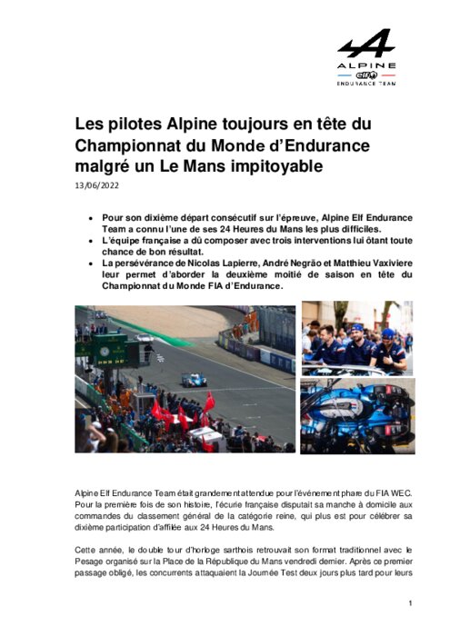 Pour son dixième départ consécutif sur l’épreuve, Alpine Elf Endurance Team a connu l’une de ses 24 Heures du Mans les plus difficiles. L’équipe française a dû composer avec trois interventions lui ôtant toute chance de bon résultat. La persévérance de Nicolas Lapierre, André Negrão et Matthieu Vaxiviere leur permet d’aborder la deuxième moitié de saison en tête du Championnat du Monde FIA d’Endurance.